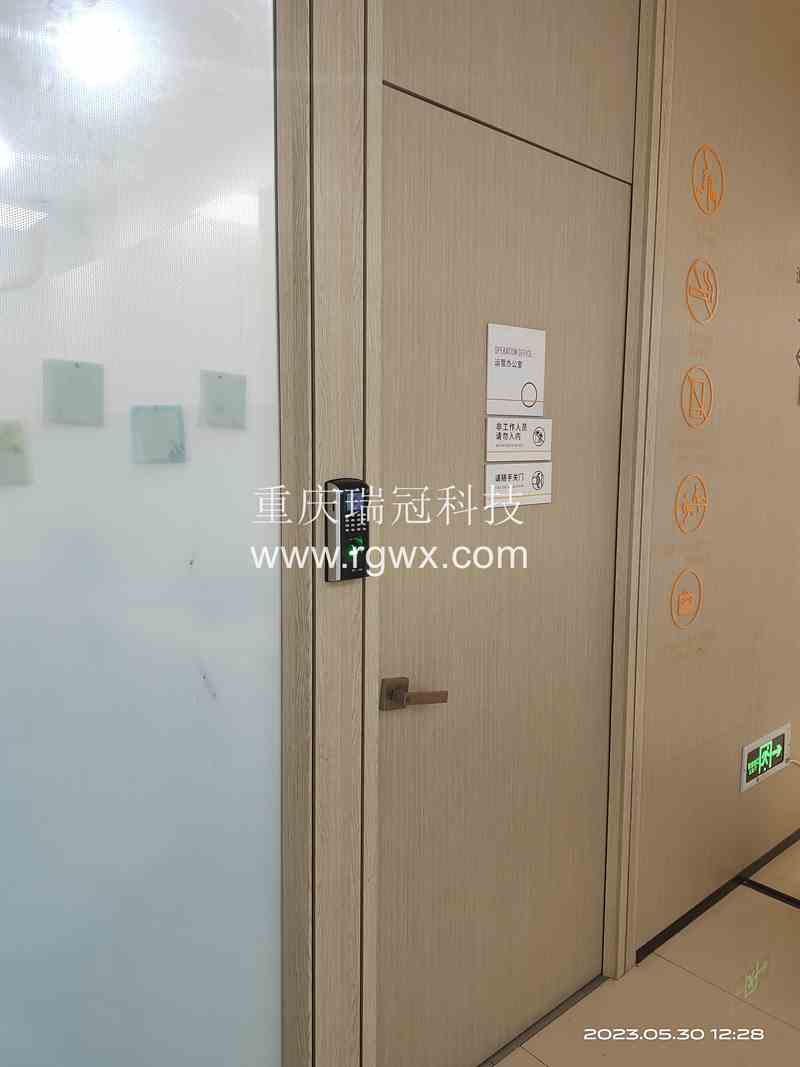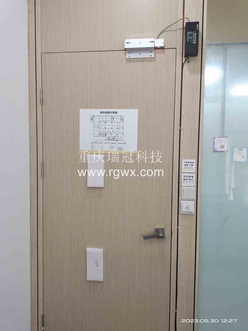 重慶市江北區石馬河街道(冉家壩,南橋寺,大石壩,人和,大竹林,龍湖源著天街旁邊)兩江春城璽苑寫字樓4號樓上一培訓機構門禁安裝。客戶門為單門木門,門框為木框,要求安裝一套單門門禁磁力鎖,外面刷卡,指紋,密碼開鎖,里面安裝出門按鈕。此門位置特殊,需要安裝Z型支持才能正常安裝。此處上方無其它隔板,于是門禁電源安裝于門框上方。線路大部分可隱藏安裝,便于美觀。